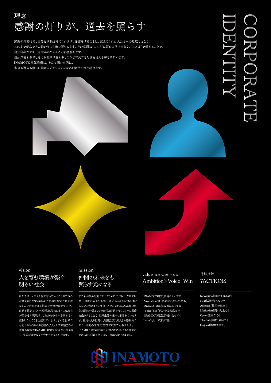 感謝の気持ちは、自分を成長させてくれます。感謝をすることは、支えてくれた人たちへの恩返しとなり、これまで歩んできた道のりにも光を照らします。その感謝は“こころ”に留めるだけでなく、“ことば”で伝えることで、自分自身がより一層磨かれていくことを理解します。自分が変われば、見える世界は変わり、これまで見てきた世界さえも輝きはじめます。INAMOTO電気設備は、そんな想いを胸に、未来も過去も照らし続けるプロフェッショナル集団で在り続けます。